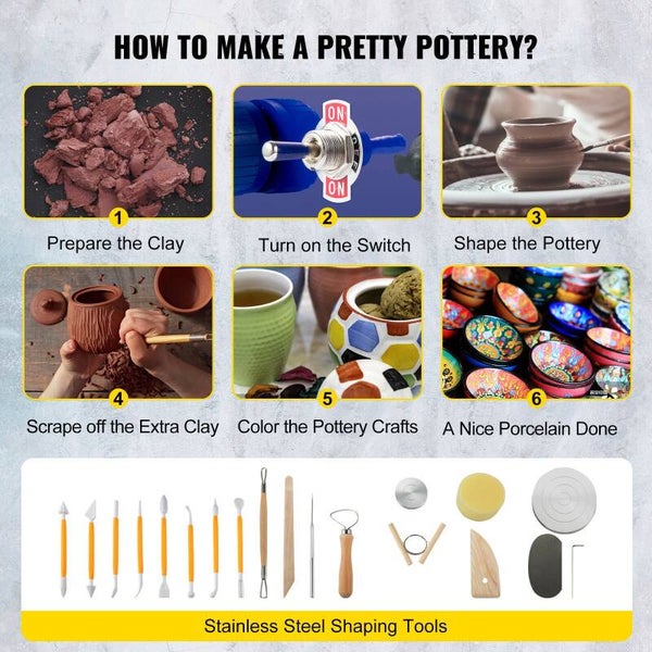 - · Volledig Uitgeruste Beeldhouwgereedschappen: Een set vormgereedschappen (16 stuks gereedschap) die door dit aardewerkwiel worden geleverd, helpt u bij het maken van uw servies, vazen en andere keramische kunstwerken. Ondertussen is de hele machine volledig waterdicht en bestand tegen hoge temperaturen.