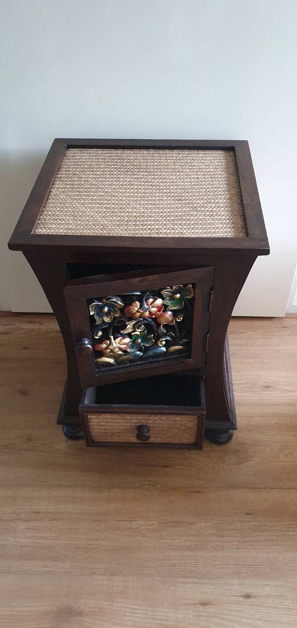Dit Thaise nachtkastje gemaakt van hout en rotan siert dromerig mooie kleurrijke bloemornamenten. Donker, goed verwerkt massief hout en filigraanrotan vormen een evenwichtige en harmonieuze symbiose. U kunt de hoge Thaise wooncultuur leren kennen in de Aziatische woonstudio. Alleen echt en uitgebreid handwerk kenmerkt al onze woonaccessoires en meubels zoals deze prachtige sieradenkast. Een echt ruimte- en ruimtewonder met het uitnodigende, grote compartiment en de extra praktische lade voor kleinere alledaagse gebruiksvoorwerpen.