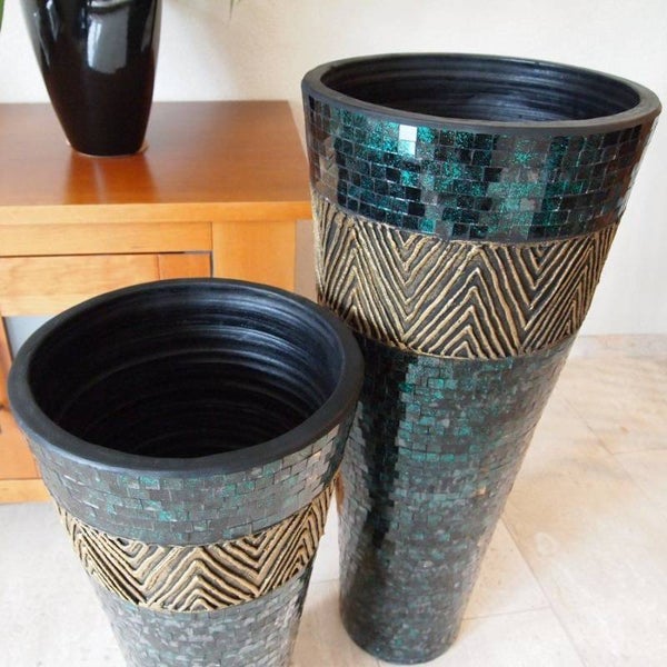 Deze mozaïekvazen zijn gemaakt van terracotta, ingelegd met stukjes glas in mozaïek. Als deze vazen "gevangen" worden door het zonlicht dan zie je het extra effect van deze mozaïek pas goed en worden ze een echte blikvanger in elke kamer.