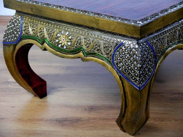 Opiumtafel met "goudkleurige decoratie en rood tafelblad"