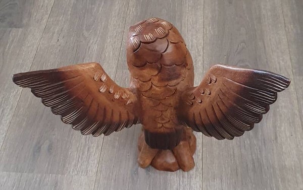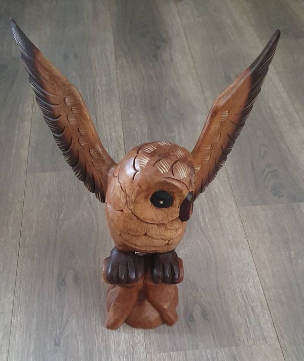Laat de uil op u werken. Neem je tijd en laat rust, harmonie en balans tussen lichaam en geest naar voren komen terwijl je naar deze handgesneden vogel kijkt. Ogen open, de brede, elegante vleugels spreiden beschermend over de eigenaar.