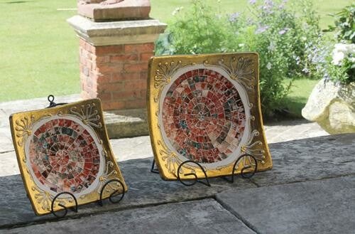 Een set van 3 goudkleurige vierkante borden van verschillende afmetingen, met een ingewikkeld mozaïek cirkelvormig ontwerp