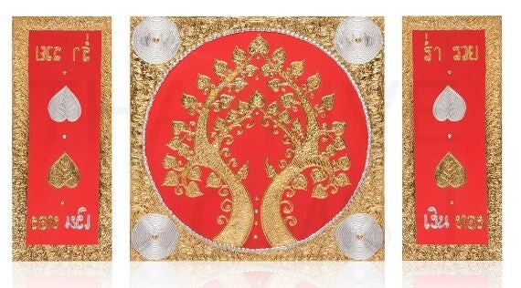 Het schilderij is gemaakt in een traditioneel Thais proces in Chiang Mai. Bladgoud werd ook gebruikt in nauwkeurig handwerk.