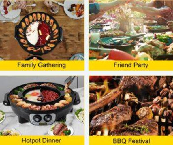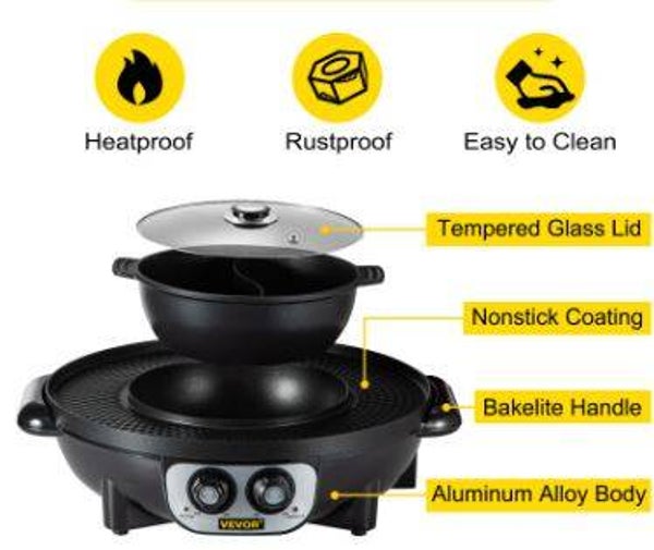 De 2-in-1 Indoor Grill is groot genoeg voor 1-8 bijeenkomsten. De functies van een hete pot en een grillpan zijn gecombineerd in dit ene aanrechtapparaat. Het heeft twee afzonderlijke verwarmingsbuizen die in totaal 2200W vermogen leveren. Het is gemaakt van hoogwaardig materiaal, waaronder een behuizing van gegoten aluminium met een anti-aanbaklaag, een deksel van gehard glas en handgrepen van bakeliet voor duurzaam gebruik. Het is uitgerust met instelbare temperatuurregelknoppen met 5 snelheden en een olielekkagepoort. Deze machine is ideaal om thuis te koken.