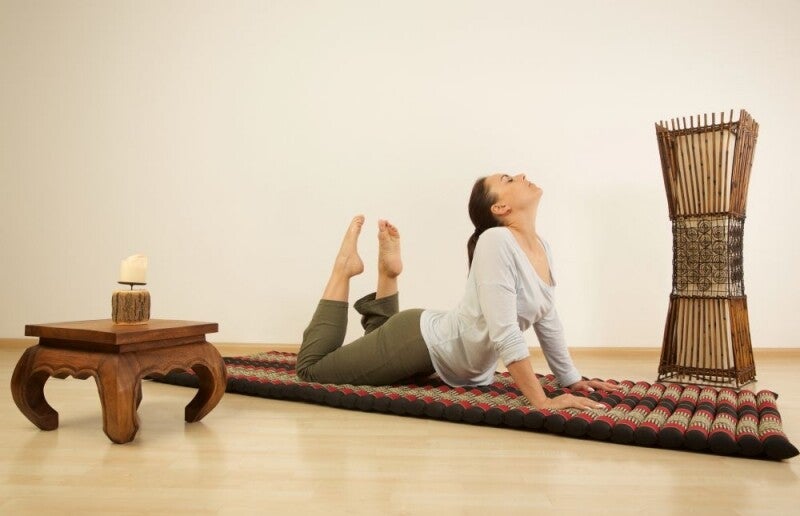 en gevuld met kapok, wat de mat een goede stabiliteit geeft. De opgerolde mat heeft een diameter van ongeveer 30 cm.