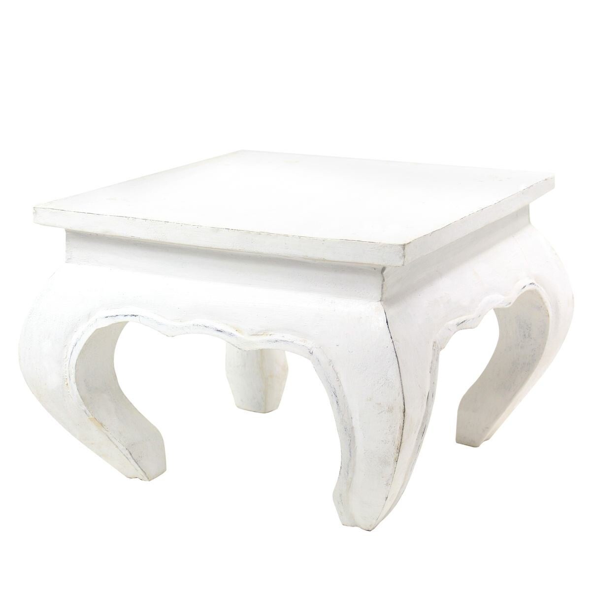 De opiumtafel in de kleur wit is gemaakt in een shabby chic stijl, dus afgebladderde verf, eigenaardigheden en krassen maken deel uit van het ontwerp en zijn geen reden tot reclamatie.